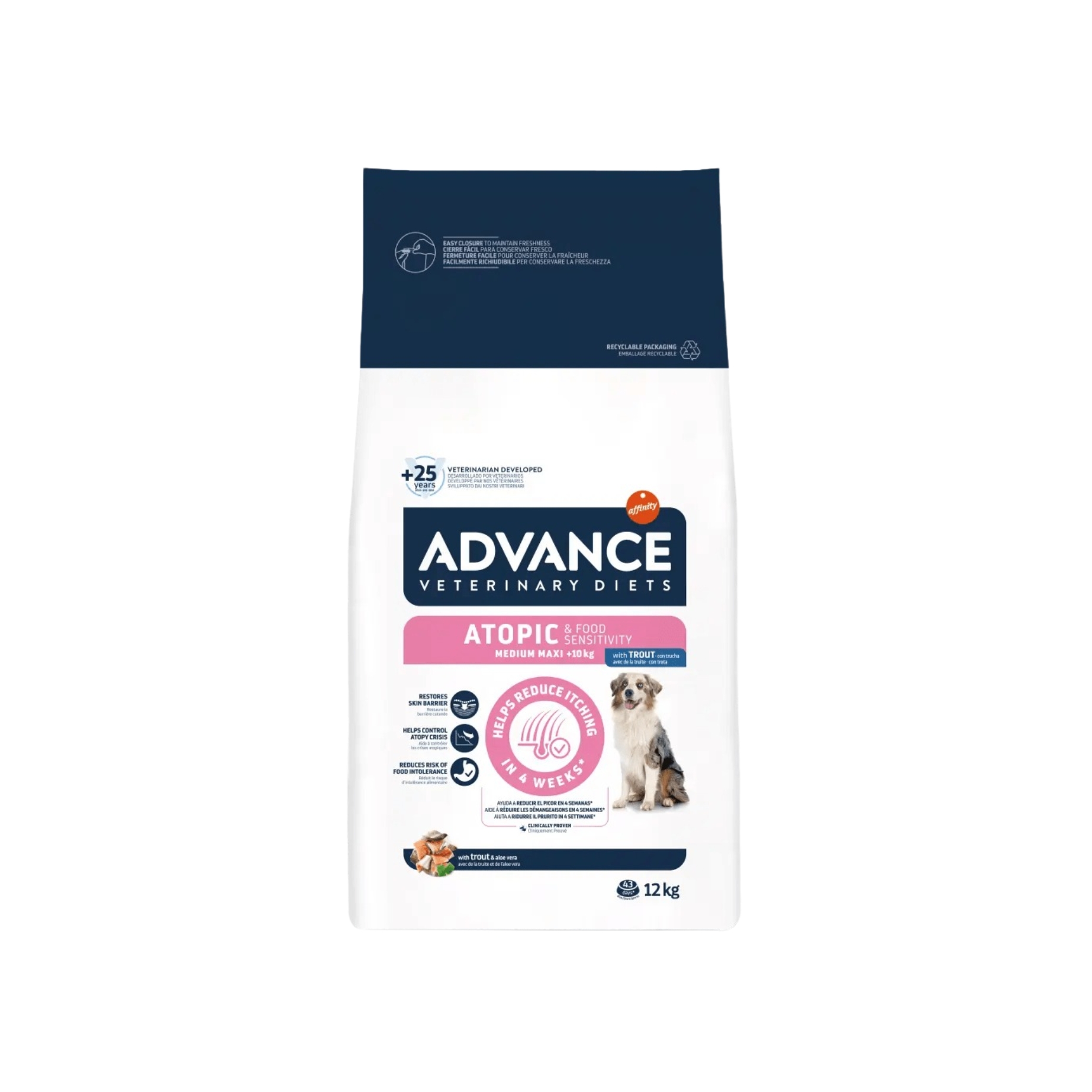 ADVANCE VETERINARY DIETS Atopic Medium/Maxi es un alimento dietético completo y equilibrado para perros adultos y cachorros de más de 4 meses de tamaño mediano y grande, formulado para cuidar de la piel en caso de dermatitis y pérdida de pelo excesiva, así como para reducir de intolerancias a ingredientes y nutrientes.