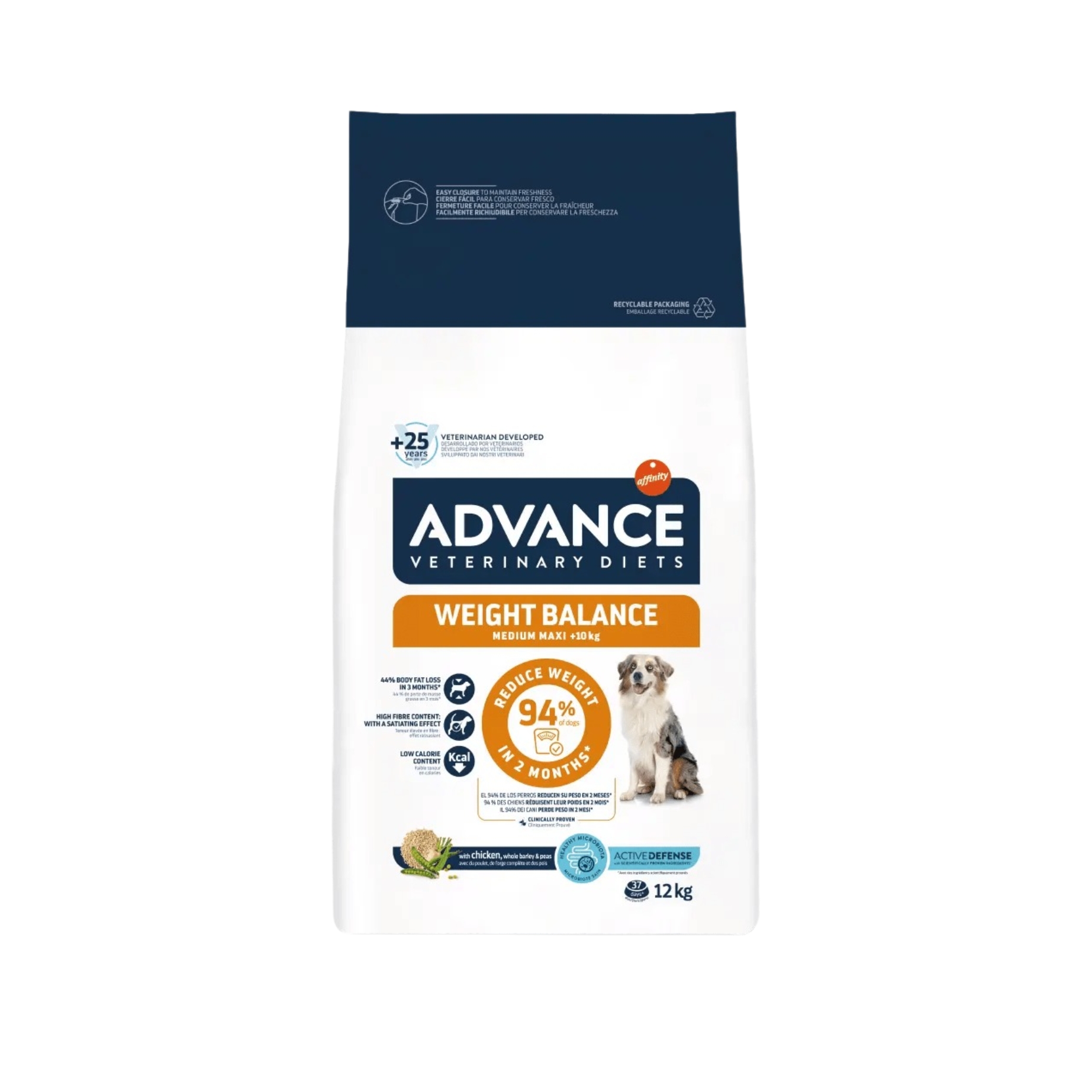 ADVANCE VETERINARY DIETS Weight Balance Medium/Maxi es un alimento dietético completo para perros adultos de tamaño medium/maxi formulado para reducir el exceso de peso y regular el metabolismo lipídico en caso de hiperlipidemia, con niveles bajos de energía, bajo contenido de grasa y alto contenido de ácidos grasos esenciales