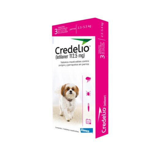 Credelio Antipulgas Para Perro 2.5-5.5KG  Tratamiento y Prevención Efectiva de Pulgas y Garrapatas: es un comprimido masticable que contiene Lotilaner, diseñado para el tratamiento y prevención de infestaciones de pulgas y garrapatas en perros de 2.5 a 5.5 kg.
