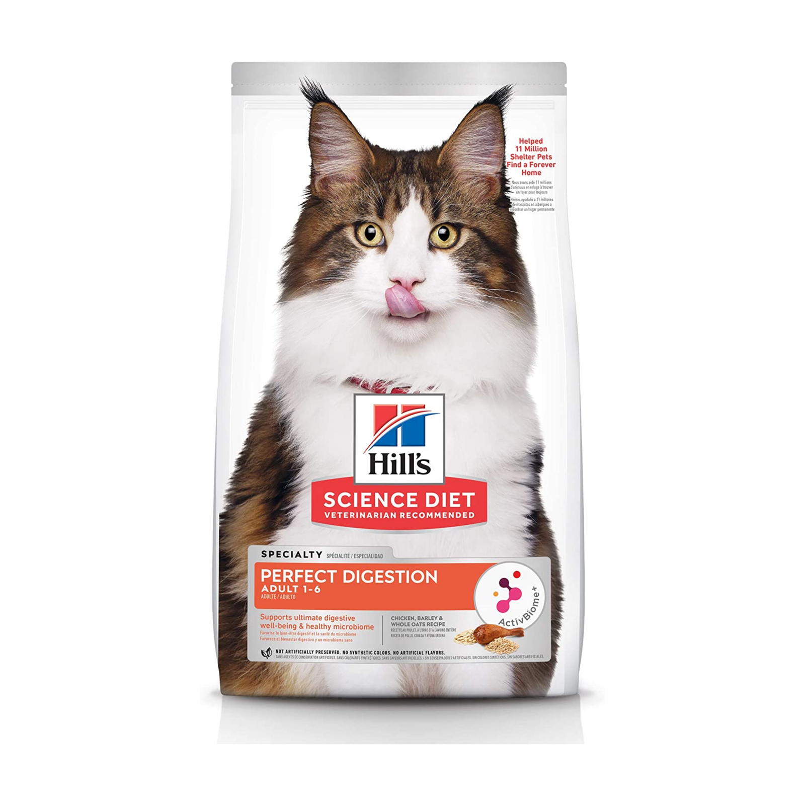 Hill’s Science Plan Perfect Digestion alimento para gatos adultos con pollo y arroz integral contiene ActivBiome+, una exclusiva combinación de prebióticos de Hill’s que ayuda a nutrir y a equilibrar rápidamente el microbioma intestinal específico de cada mascota.