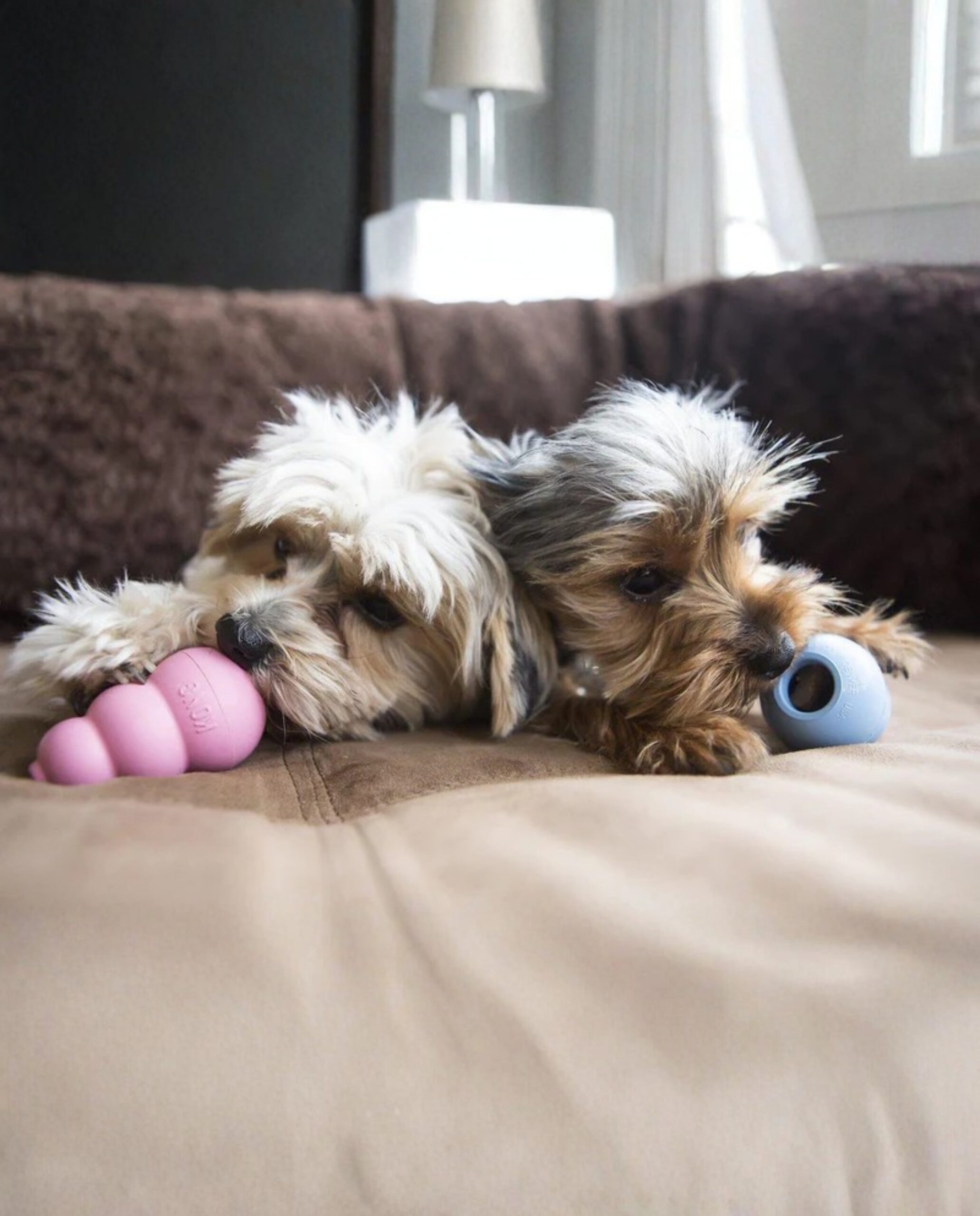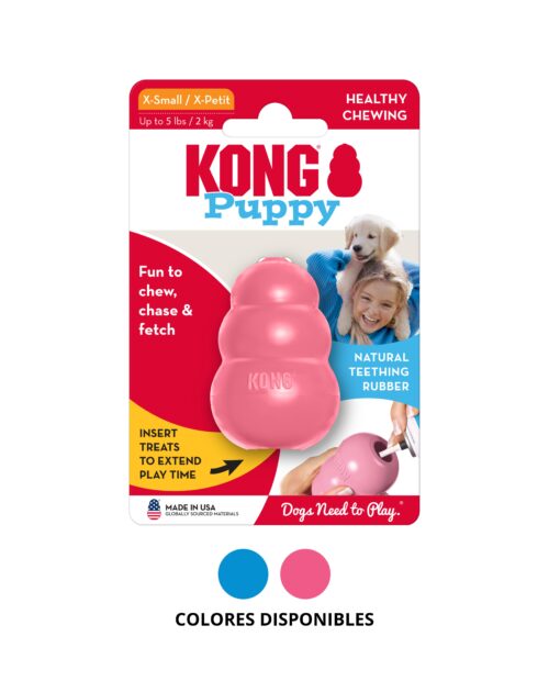 El juguete para perros Puppy KONG está adaptado para los dientes de leche de un cachorro que está creciendo; su exclusiva fórmula de caucho completamente natural es la más suave de la línea de juguetes de caucho KONG. Diseñado para satisfacer las necesidades de los 28 dientes de leche de un cachorro, contribuye al aprendizaje de comportamientos de masticación apropiados a la vez que aporta beneficios y satisface las necesidades instintivas de los cachorros más pequeños. Sus rebotes erráticos lo convierten en el juguete ideal para esos cachorros que solo quieren jugar. Un Puppy KONG relleno mantiene ocupados a los más chiquitos mientras permite que sus dueños se encarguen de sus propias necesidades. ¿Desea facilitar el entrenamiento para jaula o prolongar el tiempo de juego? Rellénelo con alimento balanceado para cachorros y un toque de mantequilla de maní. Para sumar más diversión, incluya KONG Puppy Snacks y cubra con KONG Puppy Easy Treat.